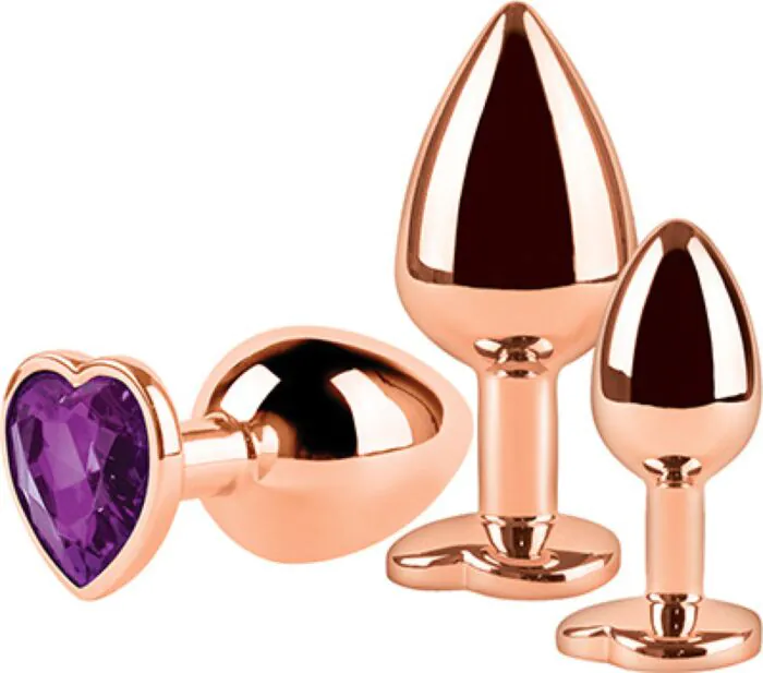 Dreiteiliges Set aus glänzendem Bronze‑Metall mit gleicher Form in drei aufeinanderfolgenden Größen. Die flache Herz‑Basis sorgt für sicheren Halt und sieht zugleich wie Schmuck aus. Gut geeignet, wenn du schrittweise an anale Penetration herangehen möchtest und Temperaturspiel magst. Für alle, die ein festes, glattes Material bevorzugen.