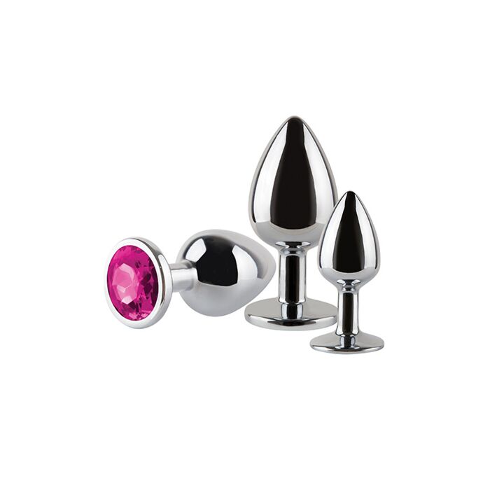 Dreiteiliges Analplug-Set aus poliertem Metall für Einsteiger, die schrittweise größere Größen testen möchten. Glatte Oberfläche und konische Spitze erleichtern das Einführen, die feste Basis sorgt für sichere Handhabung. Metall erlaubt zusätzliches Spiel mit Kälte und Wärme für variierende Empfindungen. Ein robustes Lustspielzeug, das sich leicht reinigen lässt und in jedem Erotikshop als hochwertiges Intimprodukt auffällt.