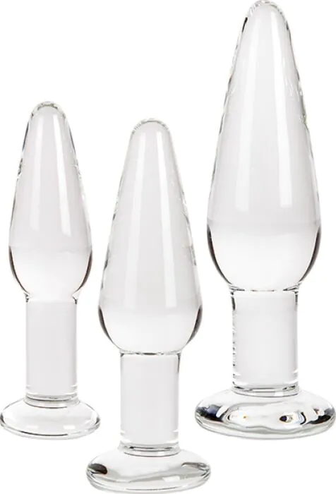 Drei elegante Glas-Analplugs von S Pleasures Crystal, abgestuft in Größe, glatt und mit konischer Spitze für sanfte Einführung. Perfekt für Einsteiger, die Kontrolle und Präzision mögen sowie mit Temperaturspielen experimentieren wollen. In unserem Erotikshop ein langlebiges, leicht zu reinigendes Sexspielzeug, das sich mit jedem Gleitmittel verträgt — ideal für schrittweises Training.