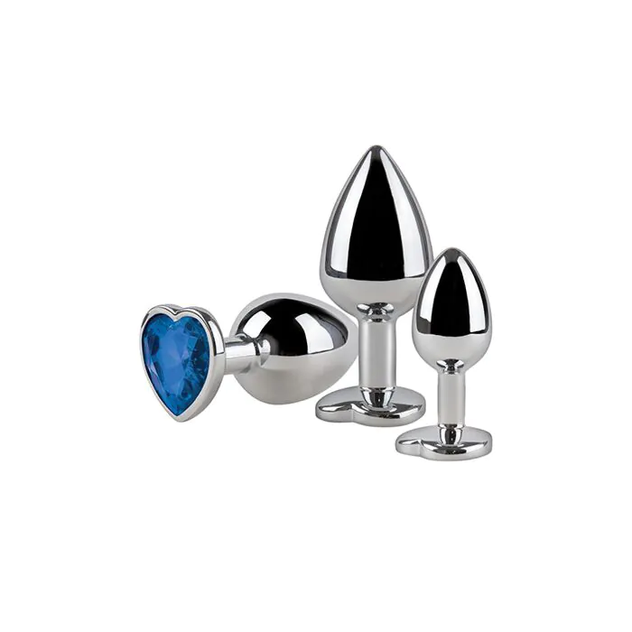 Dieses 3er-Set aus silbern glänzendem Metall ist für analen Gebrauch konzipiert und richtet sich an Einsteiger, die sich schrittweise an Penetration herantasten möchten. Die konische Spitze erleichtert das Einführen, die glatte Oberfläche reduziert Reibung und sorgt für ein bequemes Gefühl. Die flache Basis mit Herz‑Schmuck dient als sicherer Halt und verhindert ein unbeabsichtigtes Verrutschen.