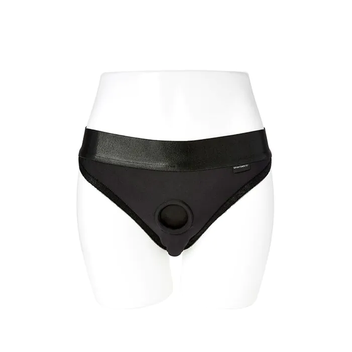 Der Silhouette Harness-M von Sportsheets ist ein enganliegender Harness aus weichem, dehnbarem Stoff, gedacht dafür, das Sexspielzeug sicher am Körper zu halten und sich dabei auch als Unterwäsche angenehm zu tragen. Du spürst einen festen Sitz durch die robuste elastische Riemenführung, die gleichzeitig nachgibt, damit der Harness den ganzen Tag über bequem bleibt. Das besondere Merkmal ist der eingearbeitete Nitril-O-Ring (Ø 1,5" / 3,81 cm), der Spielzeuge mit einem passenden Schaft sicher fixiert. Zwei eingearbeitete Taschen für kleine Bullet-Vibratoren bieten extra Stimulation, während die großzügige Öffnung im Schritt mehr Spielraum beim Sex lässt.