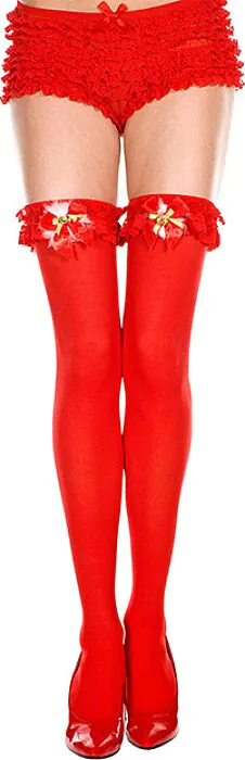 Opake Strümpfe von Music Legs mit dekorativer Schleife und kleinem Glöckchen am Strumpfband. Ein simples, aber auffälliges Accessoire für Weihnachts- oder Kostümlooks. Für dich, wenn du ein verspieltes Detail suchst; nicht geeignet, wenn du präzise Größen- oder Materialangaben brauchst.