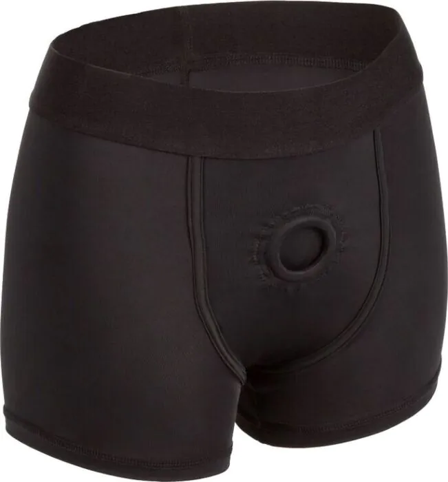 Bequemer Boxer-Gurt von CALEXOTICS in Größe L/XL: elastisches Nylon/Spandex-Material, extra breiter Bund und verstärkter, dehnbarer O‑Ring für viele Dildos und Packings. Sitzt eng und diskret unter Kleidung, eignet sich für Einsteiger und erfahrene Nutzer, die Wert auf Tragekomfort und Alltagstauglichkeit legen.