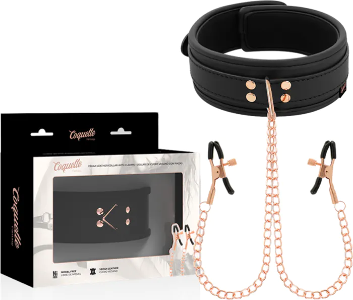 Der COQUETTE CHIC DESIRE Fantasy Halsband bietet intensive Kontrolle mit einem angenehmen Tragegefühl. Hergestellt aus weichem, veganem Leder und ausgestattet mit Nippelklemmen, bietet er sowohl Komfort als auch Spannung. Die verstellbaren Klemmen sorgen dafür, dass du die empfehlenswerte Intensität für dich findest, während die mitgelieferte Kette deine Partnerin oder deinen Partner sicher an Ort und Stelle hält.