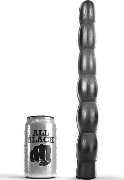 Langer, geriffelter Anal Dildo von ALL BLACK: weich und flexibel, für analen und vaginalen Gebrauch konzipiert. Mit 32 cm Länge und ca. 4,5 cm Durchmesser richtet er sich an Nutzer/innen, die ein kräftigeres, flexibles Sexspielzeug suchen. Wird einzeln verpackt geliefert und ist mit Wasser- und Silikon-Gleitmitteln kompatibel.