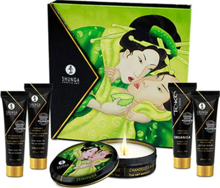 Kompaktes Erotik-Set von Shunga in Reisegröße mit grünem Tee Aroma – perfekt als Geschenk oder zum Ausprobieren. Enthält kussbares Massageöl, wärmendes Aphrodisiakum, Mini-Massagekerze, Gleitmittel und Sensibilisierer. Für Paare und Einsteiger, die Wert auf sinnliche Kosmetik legen; nicht gedacht als Vorratspack für Daueranwender.