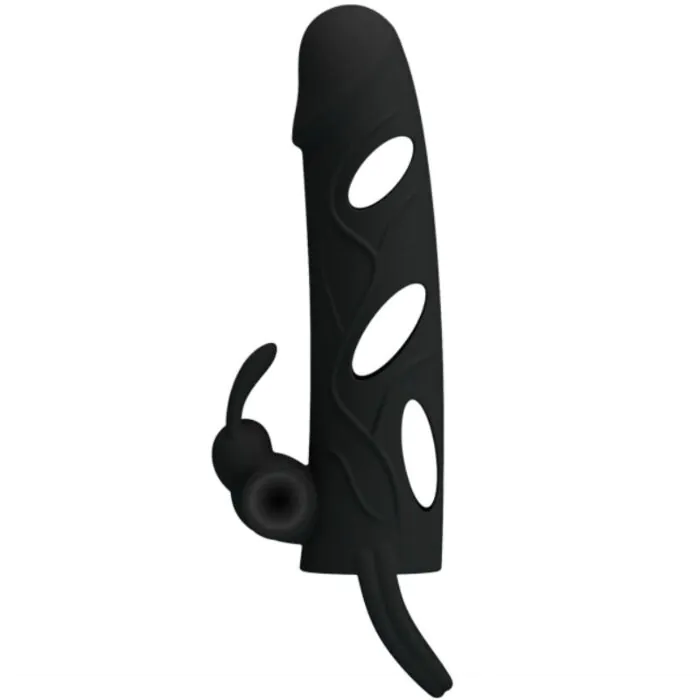 Diese Penishülle von PRETTY LOVE ist eine silikonbasierte Hülle mit integrierter Vibrationskugel und einem kleinen "Rabbit"-Aufsatz zur äußeren Stimulation. Wenn du im Erotikshop nach einem Lustspielzeug suchst, das sowohl Länge als auch direkte Klitorisstimulation liefert, ist das hier eine praktische Lösung. Die Konstruktion kombiniert eine griffige, strukturierte Außenfläche mit einem Hodengriff, der zusätzlichen Halt gibt und helfen kann, den Zeitpunkt der Ejakulation zu kontrollieren.