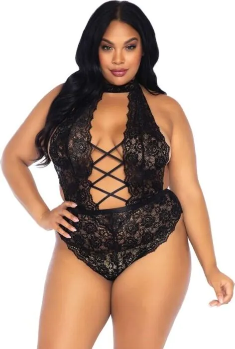 Dieser Ouvert-Teddy von Leg Avenue kombiniert florale Spitze mit einer vorderen Öffnung und dekorativer Schnürung. Er ist für alle, die eine verführerische Passform mit leichtem Stretch suchen. Besonders geeignet, wenn du Komfort in Übergröße und ein offenes, sinnliches Detail willst. Nicht für Personen, die starke Stützwirkung oder blickdichte Unterwäsche erwarten.