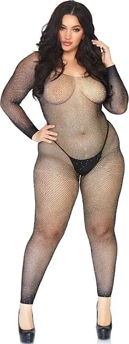 Nahtloser Netz-Bodystocking von Leg Avenue in Größe 1X-2X mit langen Ärmeln und dezenten Strass-Applikationen. Für kurvige Figuren, die einen enganliegenden, atmungsaktiven Look mit leichtem Glanz wollen. Sitzt körperbetont dank elastischem Material und lässt sich vielseitig tragen — von intimem Styling bis zu raffinierten Outfits.