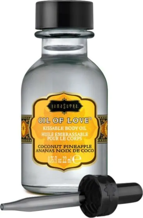 Wasserbasiertes, essbares Kissöl von KAMASUTRA COSMETICS für sinnliche Vorspiele: intensiver Kokos‑Ananas Geschmack, leichte Wärmewirkung und praktischer Applikator. Nicht als Massageöl oder Gleitmittel gedacht – perfekt, wenn du gezielt erogene Zonen betonen und küssen willst.