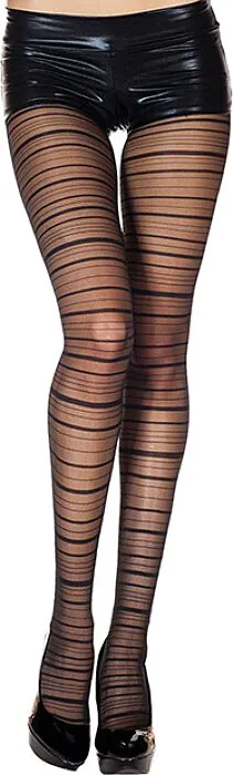 Schwarzer Panty von Music Legs mit horizontalem Streifenmuster – ein auffälliges, zugleich kultiviertes Dessous zum Kombinieren. Für dich, wenn du gern gemusterte Unterwäsche trägst und Looks mit Textur möchtest. Nicht geeignet, wenn du exakte Material- oder Größenangaben brauchst (diese Angabe fehlt beim Hersteller). Passt gut in jeden Erotikshop- oder Dessous-Look.