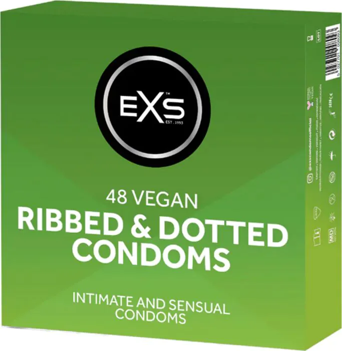 Ribbed & Dotted von Exs sind strukturierte Kondome mit Rippen und Noppen, die sexuelle Reibung intensivieren. Die 56 mm Nominalbreite bietet einen etwas weiteren Sitz und die 48er-Packung ist praktisch für regelmäßige Nutzer. Vegan und elektronisch geprüft — eine robuste, klassische Latexlösung für Paare, die Textur statt Extras wie Vibration suchen.