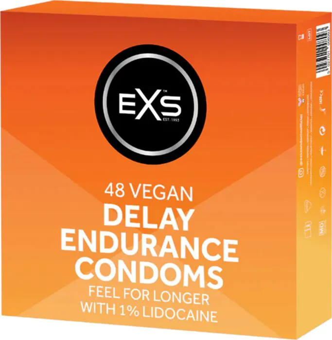 Das EXS Delay ist ein 48er-Pack Kondome aus Naturkautschuklatex, entwickelt, um die Ejakulation zu verzögern. Sie enthalten Lidocainhydrochlorid im Gleitfilm — das wirkt lokal leicht betäubend an der Penisspitze und kann so helfen, den Samenerguss hinauszuzögern. Die Kombination aus natürlichem Latex und Silikon-Gleitmittel bietet die vertraute Haptik mit zusätzlichem Gleitschutz.