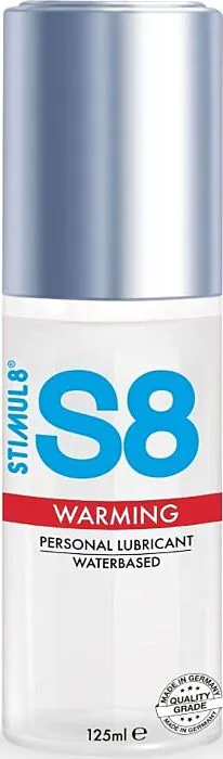 Wasserbasiertes, wärmeaktiviertes Gleitgel von STIMUL8 S8 (125 ml) für Paare und sensible Haut. Bietet ein sanftes, sofortiges Wärmegefühl und eine langanhaltende Gleitwirkung. Frei von Parabenen, Phthalaten, Gluten und Sulfaten — gut geeignet, wenn du ein neutrales, körperverträgliches Gleitmittel mit einer dezenten Wärmewirkung suchst.