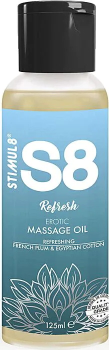 Das STIMUL8 S8 Refresh Massageöl ist eine pflanzenölbasierte Mischung aus drei Ölen (Jojoba, Mandel, Sesam), angereichert mit Vitaminen und Mineralien. In der Duftvariante „Refresh“ verbindet sich eine fruchtig-weiche Note von französischer Pflaume mit einem Baumwoll-Akkord — das Produkt ist als sinnliches Pflegeöl gedacht, nicht als wasserbasiertes Gleitmittel. Für dich bedeutet das: lang anhaltende Gleitwirkung und gleichzeitige Hautpflege.