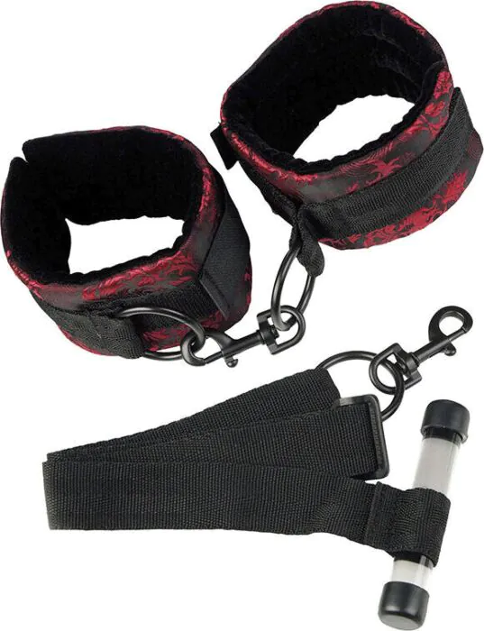 Wenn du dich beraten lassen würdest, würde ich dir so erklären: Die CALEXOTICS Scandal Türfesseln sind eine praktische Lösung, um in wenigen Sekunden eine Tür in einen Spielplatz zu verwandeln. Die Außenseite trägt ein rot-schwarzes Designerstoff, innen liegt ein ultrasanftes Plüschfutter, das längeren Tragekomfort bietet. Die Fesseln sind komplett verstellbar, passen an Standardtüren und lassen sich abnehmen, sodass du sie alternativ als klassische Handschellen hinter dem Rücken verwendest.
