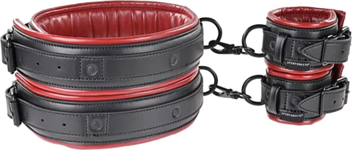 Gepolsterte Oberschenkel‑ und Handgelenksmanschetten von Sportsheets: zwei separate, verstellbare Riemen, die jeweils Oberschenkel und Handgelenk verbinden. Komfortabel gepolstert, mit gürtelähnlicher Verstellung, Clips und Schnalle für viele Fixierungsvarianten. Gut geeignet für Einsteiger und Paare, die sichere, flexible Bondage-Optionen im Erotikshop suchen.