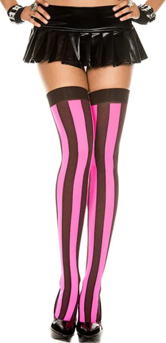 Diese gestreifte Strumpfhose von Music Legs kombiniert Schwarz und Rosa in einem deutlichen Vertikalstreifen‑Design. Sie ist für dich, wenn du ein auffälliges Accessoire suchst, das das Bein optisch streckt. Der Fokus liegt auf dem Muster; Material- und Größenangaben liefert der Hersteller nicht, daher eignet sie sich gut als modischer Akzent zu kurzen Röcken oder Dessous.