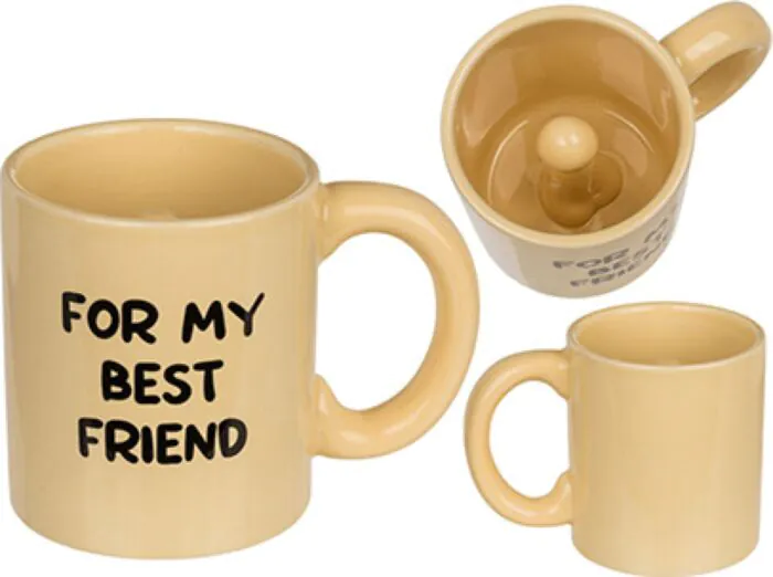 Das ist ein klassischer Keramikbecher, der als Gag-Artikel konzipiert ist: außen mit dem Schriftzug "For my best friend", innen versteckt er einen Penis — genau das Feature, das den Becher zu einem Gesprächsstoff macht. Wenn du etwas Lustiges für einen Freund oder eine Party suchst, ist das die Art Geschenk, das überrascht und lacht auslöst. Wenn du hingegen etwas dezentes oder formelles suchst, ist dieses Stück nicht das Richtige.