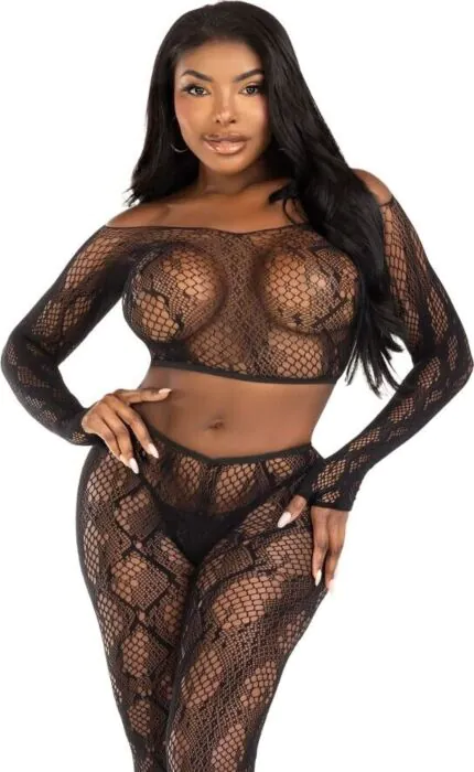 Verführerisches Set aus elastischer Spitze mit Schlangenmuster, das Ihre Figur perfekt umschmeichelt und eine aufregende Silhouette zaubert. Das schulterfreie Crop-Top und die hohen fußlosen Leggings passen bequem und bieten gleichzeitig einen Hauch von Eleganz und Kühnheit.